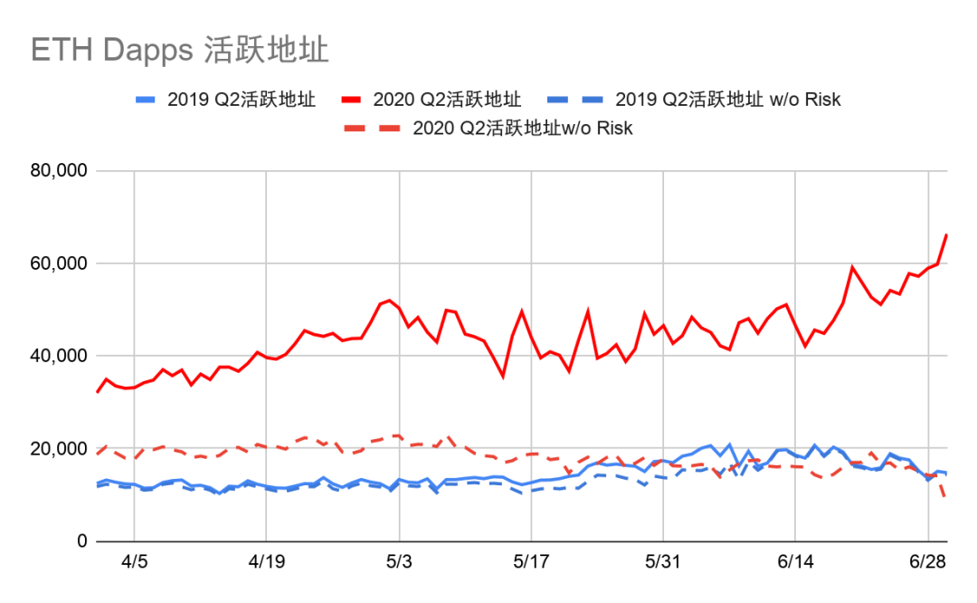 除了DeFi类Dapp以外,另一个在以太坊上飞速增长的是风险类Dapp。今年第二季度以太坊日均活跃地址数为44,359,同比增长202%,其中高风险类型,占比超过60%。如将高风险类型去除,则日均活跃地址数为18,103,同比增长34.86%。