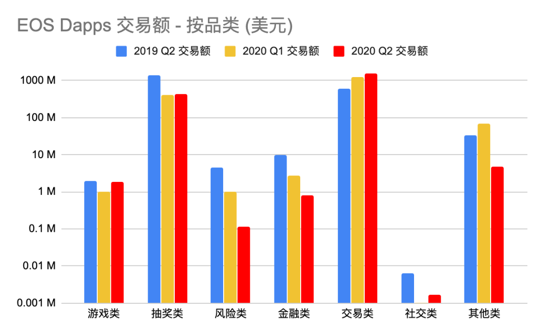 从交易额分类来看,以太坊统治了DeFi(即金融类和交易所类),EOS和波场共同瓜分了抽奖类的交易额。