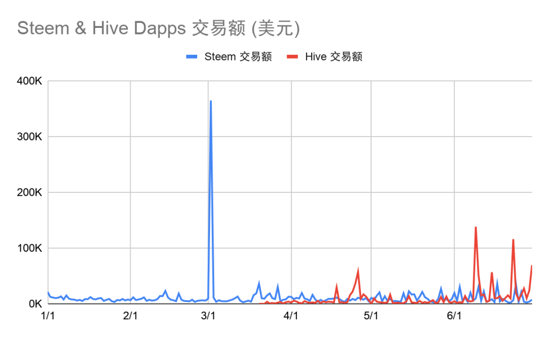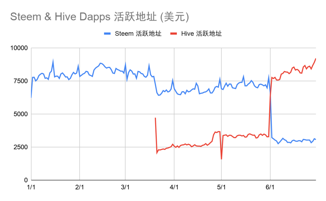 Hive是Steem在被波场基金会收购后分叉出的一条链。3月20日Hive主网上线后,多个Steem Dapp迁移/复制到了Hive上。原Steem链上最大的游戏Dapp Splinterlands在6月1号迁移到了Hive上,使得Hive上的日均活跃用户增长了136.2%,而Steem的日均活跃用户减少了58.8%。