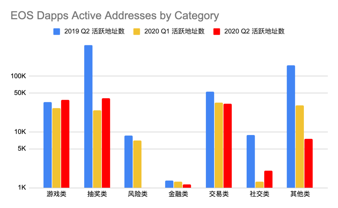 从活跃地址数来看,以太坊在风险类、金融类和交易类占据了绝对优势,波场在抽奖类独领风骚。