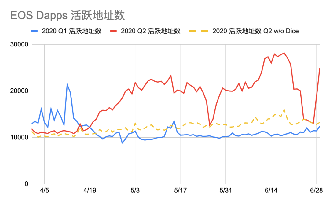 EOS第二季度Dapp总交易额为20.2亿美元,环比(Q1: 17.5亿美元)增长16.65%。第二季度EOS日均活跃地址数为18,520,环比增长62.27%,值得一提的是由于很多Dapps使用机器人小号去进行数据的造假,这些日均活跃地址中仍旧有不少水分(同样的事情也发生在以太坊和波场的Dapp上,其中主要是以博彩类和风险类Dapp为主)。