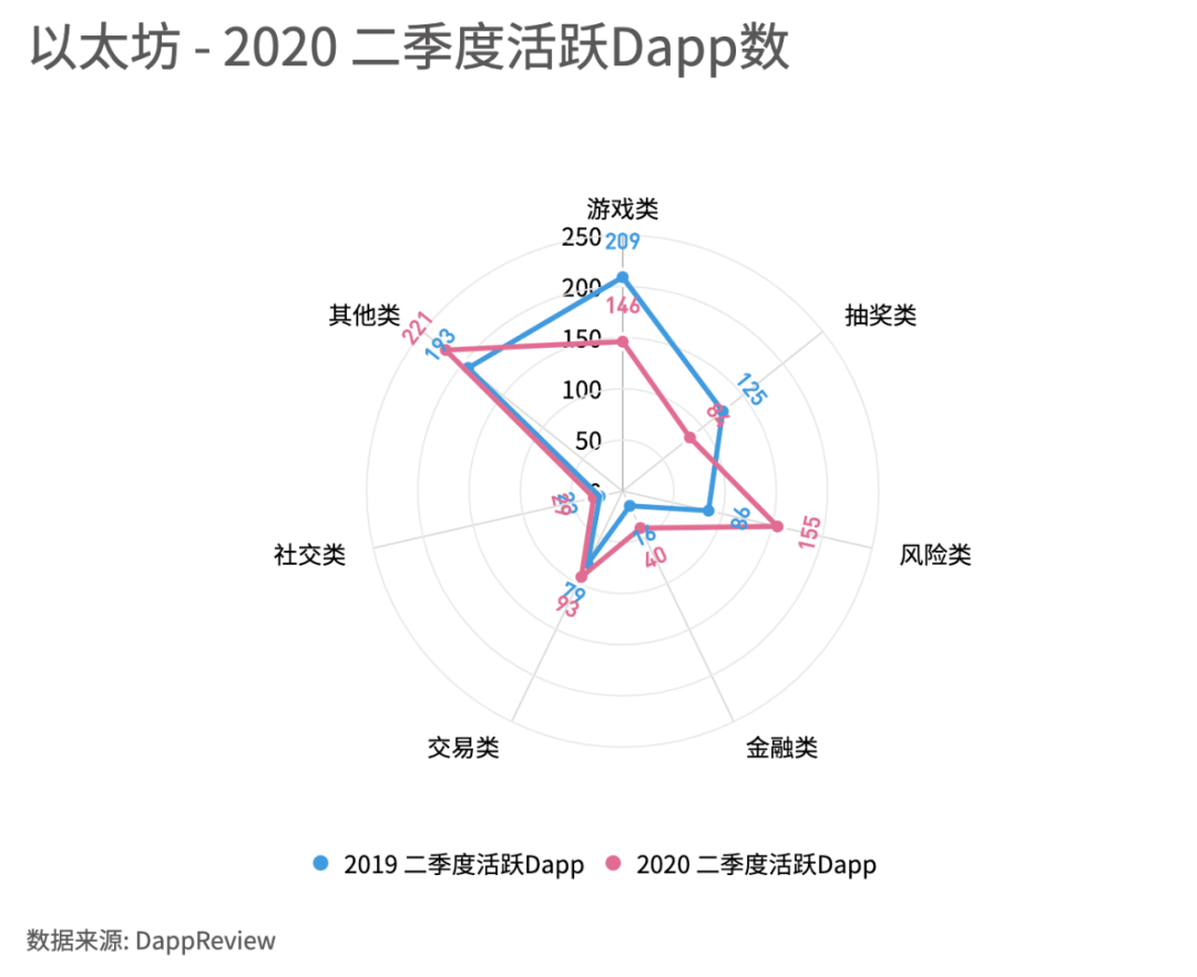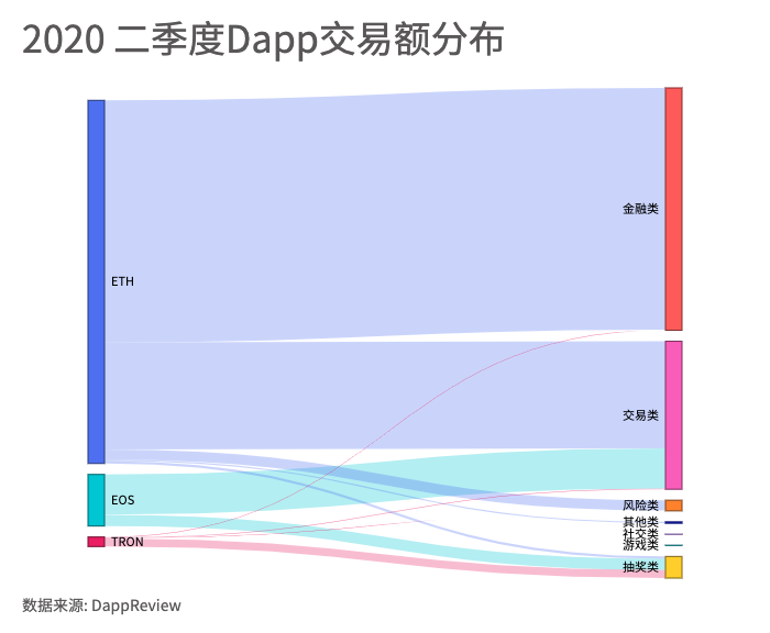 2020年Q2,以太坊Dapp依然保持着良好的多样性,游戏类、抽奖类与其他类Dapp的交易额与去年持平;金融类和交易类Dapp的交易额大幅上涨。