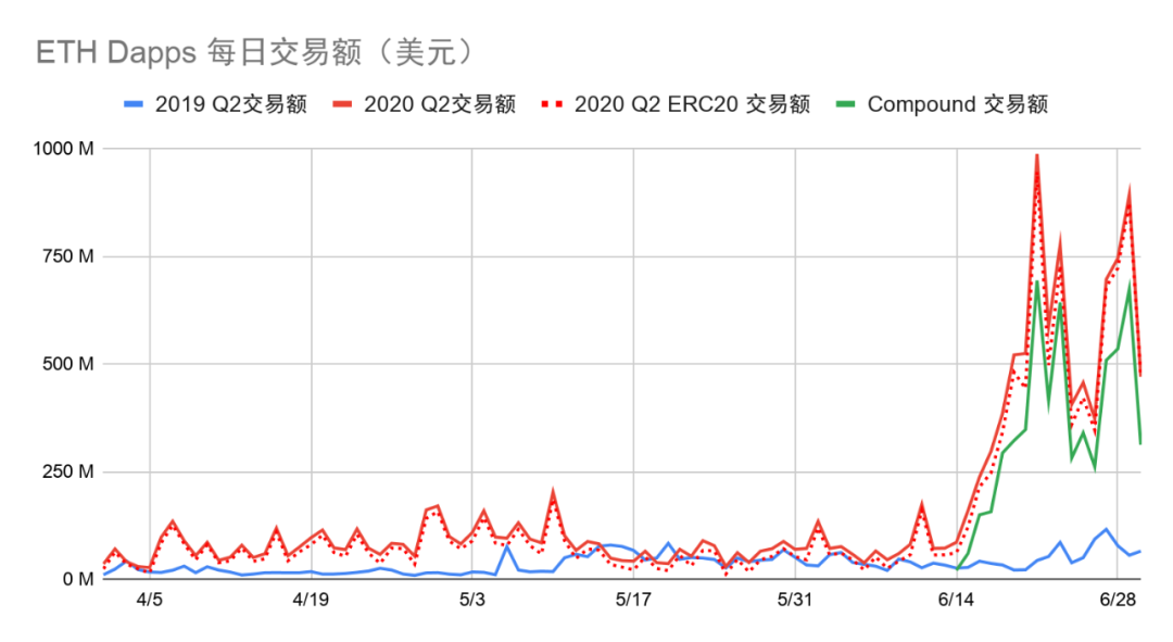 6月中下旬,Compound、Balancer、Curve等多个DeFi项目先后开启了借贷挖矿,带来大量ERC-20代币的交易量。6月21日,以太坊Dapp单日交易额创下新高,达到9.88亿美金。