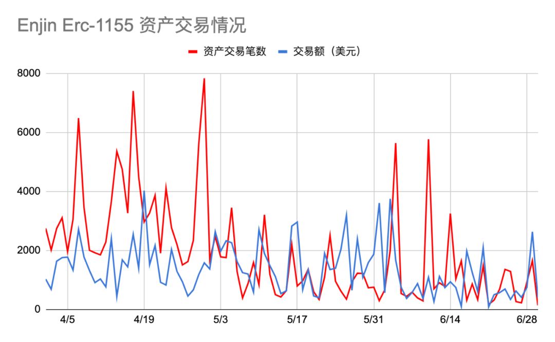 2020第二季度,Enjin平台上每日平均有1,933笔资产交易,日均交易额1,363美元。目前Enjin平台上共有6,636种资产总共铸造了10.5亿个ERC-1155NFT,总价值151万美元。