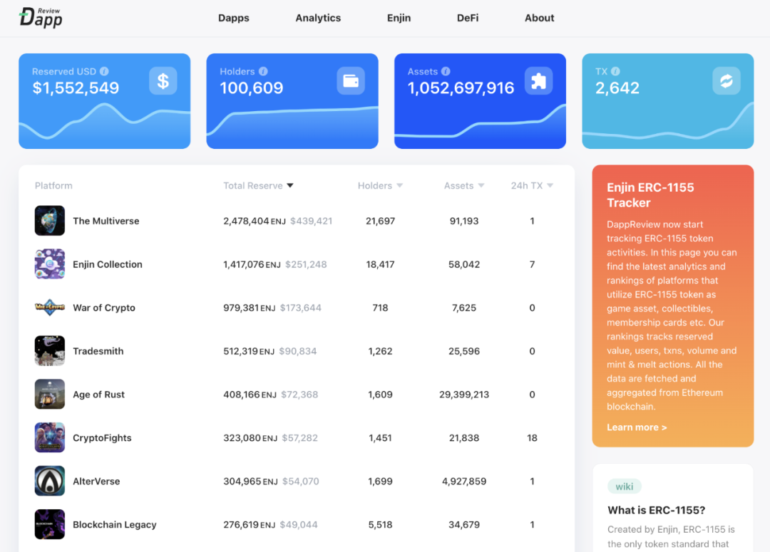 当大多数网站仅追踪ERC-20/ERC-721时,DappReview上线了全新的ERC-1155数据追踪网站 —— enjin.dapp.review。