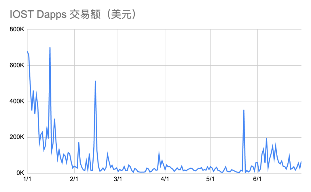 IOST是一个基于“置信度证明”(PoB) 的高性能区块链。2020年第二季度,IOST共有活跃Dapp 36个,其中游戏类XPET和抽奖类iPirates是最流行的Dapps。IOST Dapp总交易额为351万美元,环比下降65.03%。