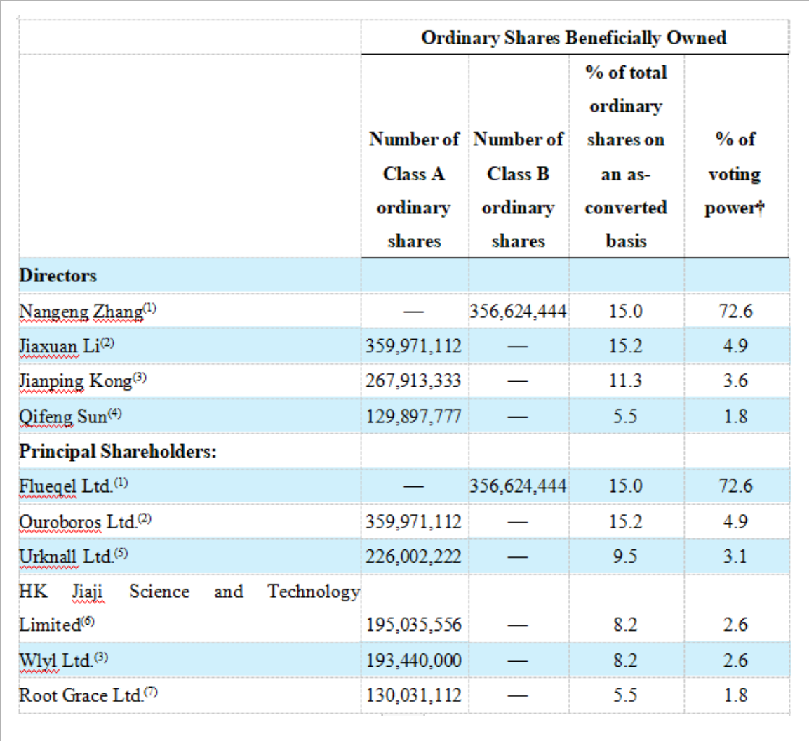 1) 张楠赓,公司董事长兼CEO。代表Flueqel Ltd.持有356,624,444股普通股,该公司是根据英属维尔京群岛法律注册成立的公司,由张楠赓及其家人为受益人的信托间接全资拥有。