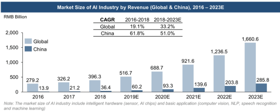近年来,全球AI行业经历了强劲的增长。根据弗若斯特沙利文(Frost&Sullivan)的数据,预计全球AI行业将继续以33.2%的复合年增长率从2018年的人民币3,963亿元增长到2023年的人民币16,660亿元,其中中国的复合年增长率估计为51.0%,超过全球平均水平到2023年末,占比达到人民币2,858亿元。