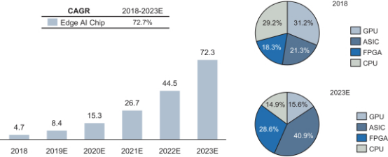 特别是ASIC芯片将得益于较低的成本,更高的单位效率和各种下游IoT应用,预计会以更快的复合年增长率增长,并获得更大的市场份额,从2018年的21.3%到2023年的约40.9%。