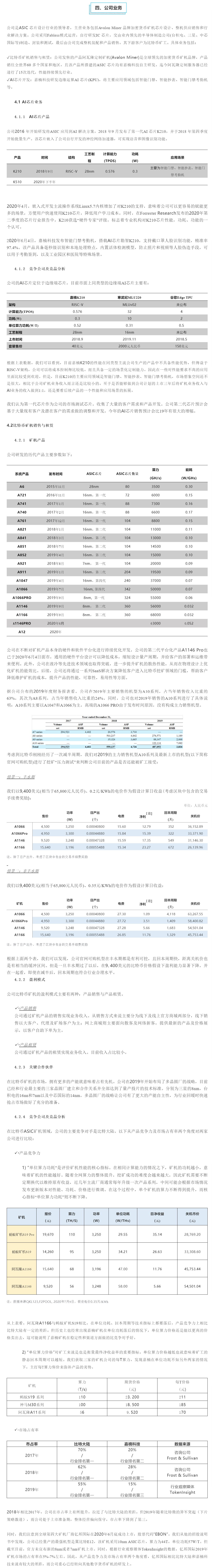 公司的核心业务是ASIC芯片的研发与制造,应用领域为比特币矿机和AI。由于ASIC 芯片具有重复执行计算的能力、较高的能效比,使得其成为区块链、数字货币挖矿、边缘计算、机器学习等方面应用具有突出的优势。