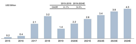 根据弗若斯特沙利文(Frost&Sullivan),全球比特币矿机行业的市场规模从2015年的2 亿美元人民币增至2019年的14 亿美元,复合年增长率为61.3%。未来五年全球比特币采矿机市场的市场规模预计达到2024 年的43亿美元,复合年增长率为24.8%。