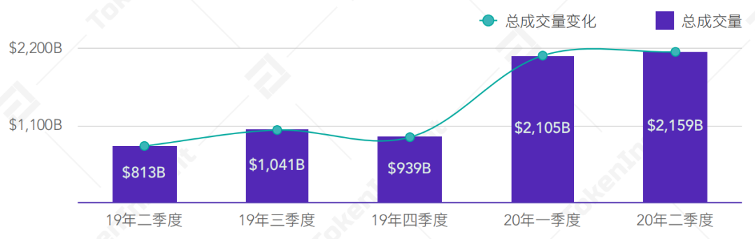 1. 维持于$2万亿 2020年第二季度,TokenInsight根据42家交易所计算,数字资产衍生品市场成交量报$2.159万亿,较上季度环比增长2.57%,较19年第二季度同比增长165.56%。
