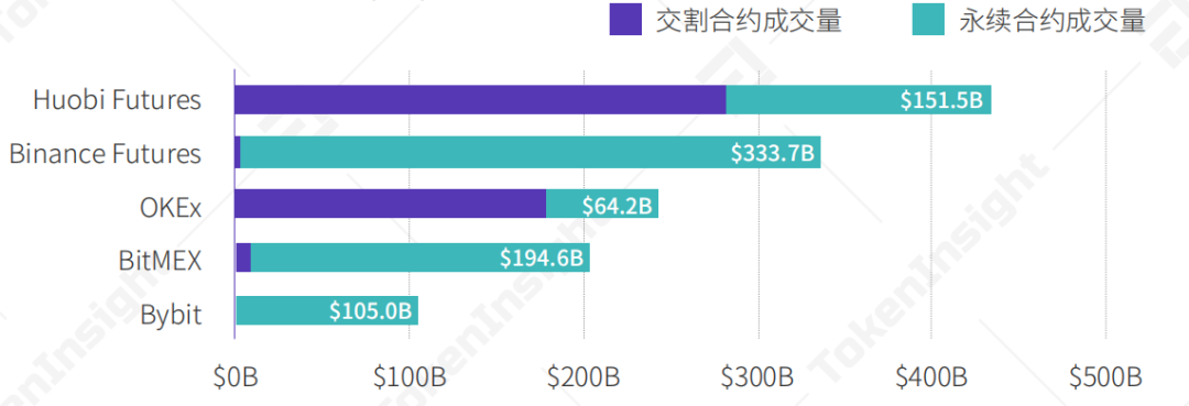20Q2 前五(以成交量计)衍生品交易所永续合约和交割合约成交量对比,来源:TokenInsight