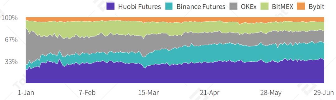 20H1 前五(以成交量计)衍生品交易所市场份额变动情况,来源:TokenInsight