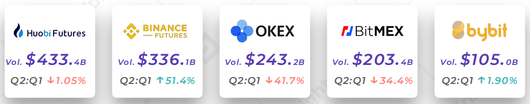 20Q2 前五(以成交量计)衍生品交易所成交量对比,来源:TokenInsight
