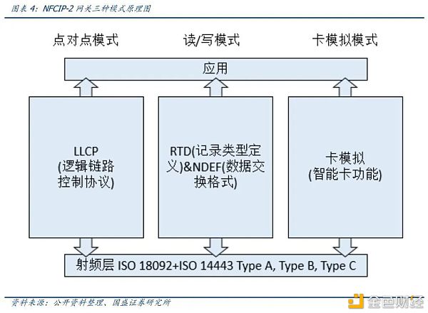 NFCIP-2 标准规定了一种灵活的网关系统,用于和非接触式智能卡兼容,具体有三种工作模式: 点对点通信模式、读写器模式和NFC 卡模拟模式。点对点模式下两个NFC 设备可以直接交换数据;例如多个支持N FC的数字相机、智能手机之间可以利用NFC 技术进行无线互联,实现虚拟名片或数字相片等数据交换。读/写模式下NFC 设备作为非接触读写器使用,从中读取非接触标签中的内容,采集数据并发送到对应的应用进行处理;例如支持NFC 的手机在与标签交互时扮演读写器的角色,开启NFC 功能的手机可以读写支持NFC 数据格式标准的标签。模拟卡片模式就是将具有NFC 功能的设备模拟成一张标签或非接触卡,通过POS机(非接触读卡器)的RF来供电,即使NFC手机没电也可以工作,例如支持NFC 的手机可以作为门禁卡、银行卡等而被读取。