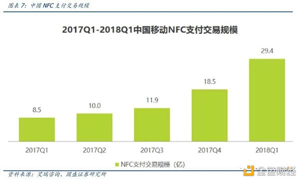 2017年我国移动NFC支付规模达到了48.9亿元,而且从2017Q1-2018Q1的环比增速来看,该市场规模正进入加速增长阶段。2018Q1我国移动NFC支付规模继续保持着加速增长的速度,达到29.4亿元。可见,虽然在支付应用规模上不及二维码支付,但NFC支付依旧拥有一定的市场。