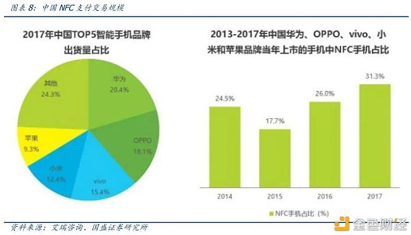 NFC将成中高端智能手机标配并逐渐普及,有利于NFC移动支付的推广。据艾瑞统计,在国内出货量TOP5的智能手机(包括华为、OPPO、vivo、小米和苹果)当中,2014-2017年上市的手机中NFC手机占比得到了明显的增长,其中2015年的占比仅为17.1%,但到2017年则增长到了31.3%。随着成本的逐渐下降,我们认为NFC将成为手机的主流配置。
