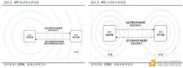 NFC 有被动模式和主动模式两种工作模式。被动模式如下图所示,NFC 发起设备( 也称为主设备) 需要供电设备,供电设备为主设备提供能量来提供射频场,并将数据发送到NFC 目标设备( 也称作从设备) ,传输速率有106kbps、212kbps 或424kbps三种选择。从设备可以不需要供电设备,原因是从设备不产生射频场,而是利用主设备产生的射频场转换为电能,为从设备的电路供电,接收主设备发送的数据,并且利用负载调制( loadmodulation) 技术,以相同的速度将从设备数据传回主设备。由于在这种工作模式下射频场不在从设备中产生,而是被动接收主设备产生的射频场,所以被称作被动模式,在此模式下,NFC 主设备可以检测非接触式卡或NFC 目标设备,与之建立连接。主动模式如下图所示,目标设备和发起设备在向对方发送数据时,都需要主动产生射频场,因此称为主动模式,这种模式下供电设备需要功能来提供产生射频场的能量。这种通信模式是对等网络通信的标准模式,连接速率非常快速。