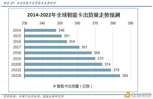 智能卡市场需求依旧强劲,下游各类应用空间广阔。随着智能卡技术的日趋成熟,智能卡的应用领域也更加广泛,不仅是NFC移动支付,在社保、金融、通信、交通、教育、安全证件、医疗健康等多个领域都得到规模化的发展与应用。由于NFC技术的拓展性、便捷性、安全性等优势,智能卡市场需求潜力巨大,下游应用空间广阔。2018年全球智能卡出货量达368亿张,较2017年上涨2%。预计到2022年全球智能卡出货量将达到384亿张。