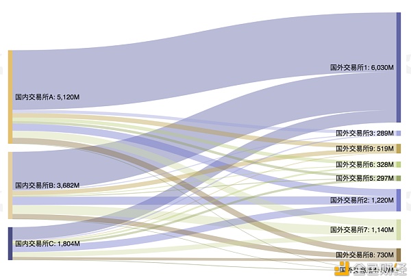 由于现在交易所注册在世界各地,有着不同的用户群体,我们分析各主要交易所的每天的资产余额以及交易所之间的资产流动情况,某种程度上,交易所可以和国家产生一些对应关系,分析一些交易所之间的资金流动,基本等于数字资产在不同国家之间的流动。