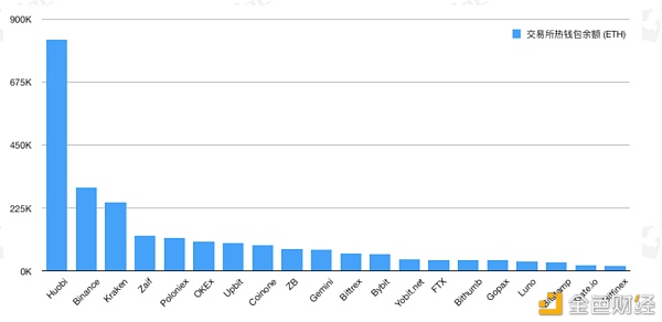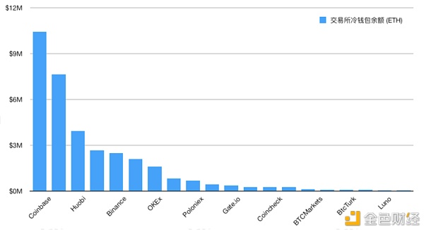 如图十所示,交易所的冷钱包 ETH 资产排行情况,Coinbase 拥有 1,044 万个 ETH 排行第一位,Bitfinex 拥有 764 万个 ETH 排行第二位,排名第三位的是火币,拥有 394 万个 ETH。