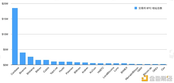 BTC 方面:其中 Coinbase 交易所拥有个 1,851 万地址,排名第一位,Binance 交易所拥有地址 400 万个,排名第二位;排名第三位的是 Bitstamp 交易所,拥有地址 265 万个;