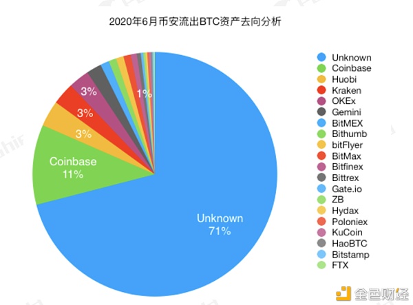 如下图十五、图十六所示,我们分别统计了今年六月币安交易所资产流进流出资金情况发现:过去一月,未知地址流入币安交易所的资产共计 39.88 万个BTC,占比70%,而从火币流入币安的 BTC 有 5.12 万个,占比9%,OKEx 流入币安的 BTC 有2.81万个,占比5%。而过去一月,币安交易所流入未知地址的资产共计 43.24 万个,占比70%,流向 Coinbase 交易所的 BTC 有 7.06万个,占比11%,而流向 OKEx 交易所的 BTC 有 1.92 万个,占比3%。