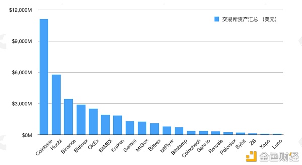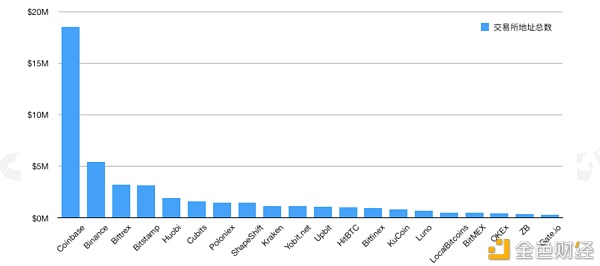 我们对已监控的不同交易所所属不同资产(主要为 BTC,ETH,和 USDT)进行汇总以美元统计发现:Coinbase 交易所的资产总量为 111 亿美元,排行第一位,Huobi 交易所资产总量为 57.9 亿美元,排行第二位,Binance 交易所资产总量 34.5 亿美元,排行第三位,Bitfinex 资产总量 29.9 亿美元,排行第四位,而 OKEx 资产总量为 25.2 亿美元排行第五位。