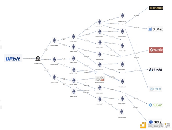 2019年年底, Upbit 交易所遭受黑客攻击损失了 3.4 万个 ETH,过去半年时间,黑客一直在持续进行资产转移、切割、分散转移、混币、洗钱等操作,且于近日全部资金已清洗完成。如图二十二所示,黑客在攻击 Upbit 交易所得手后分了四层转移,最终资金分别流入了币安、BitMax、Gate.io、Huobi、KuCoin、OKEx、BYEX 等交易所。