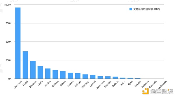 图九为交易所的 BTC 冷钱包分布情况,地址余额最大的为 Coinbase 拥有 96.2 万个 BTC,火币次之拥有 36.9 万个 BTC,而币安紧随火币之后拥有 23.8 万个 BTC。
