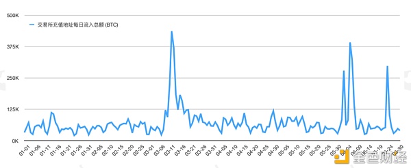 如图十三反映了今年年初以来,已统计全部交易所的 BTC 资产充值情况。数据显示,自03月09日起,BTC 充值额度就有明显的爬升,并于03月12日达到峰值,当天 BTC 充值额度达到了 43.66 万枚。众所周知,今年03月12日加密市场遭遇了一次行情血崩,当天 BTC 行情振幅最高最高达到了40%,大家等待中的减半行情没有到来,价格先遭遇了减半。从链上数据来看,充值地址的异常活跃背后可能潜伏着一次较大的行情波动可能。