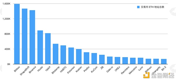 ETH 方面:Bittrex 地址 拥有 158 万个,排行第一位,ShapeShift 拥有地址146 万个,排行第二位,Binance 拥有地址 142 万个,排行第三位。