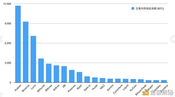 如图十一所示,交易所的热钱包 BTC 资产排行情况,Kraken 拥有 11,708 个 BTC 排行第一位,币安拥有 9,255 个 BTC 排行第二位,排名第三位的是 Luno,拥有 7,072 个 BTC。