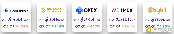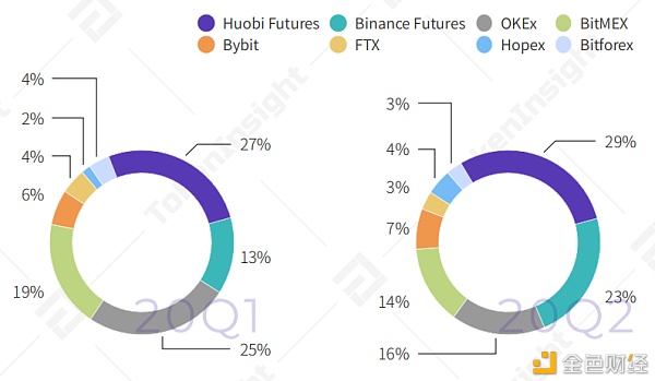 20年Q2 主力合约市场占比与上季度对比,来源:TokenInsight