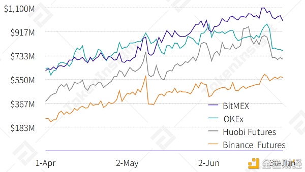 20Q2 大型综合交易所(及BitMEX)衍生品逐日持仓量,来源:TokenInsight