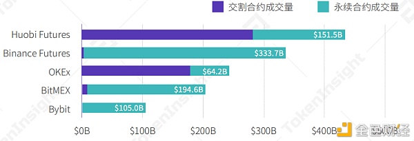 20年Q2 永续合约与交割合约成交量对比,来源:TokenInsight