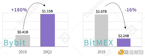 20年Q2和2019 大型衍生品交易所日均成交量变化,来源:TokenInsight