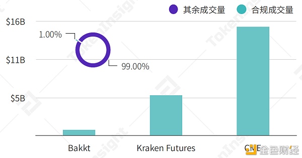 Bakkt、CME和Kraken Futures(Crypto Facilities)为本次报告所获取数据之合规交易所,本季度三者共报成交量$21.62B。