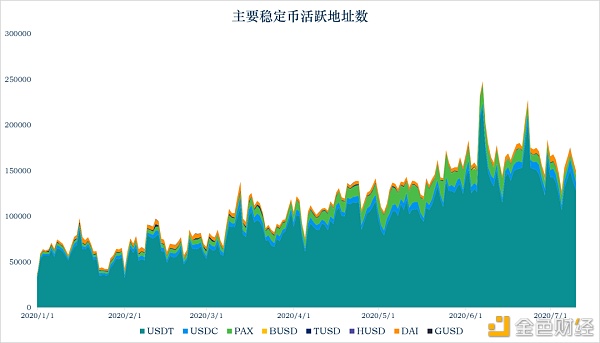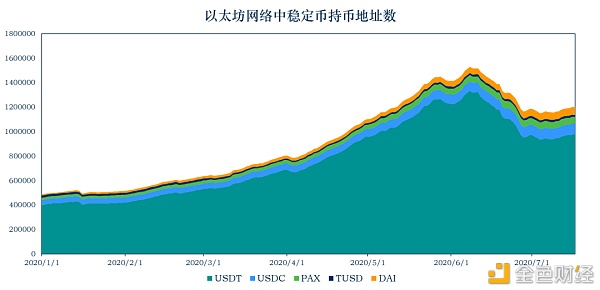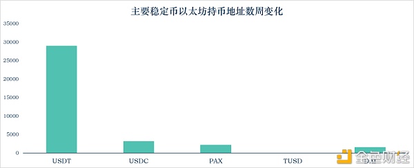 USDT、USDC、PAX、TUSD、DAI的持币地址数分别上升28995个、3181个、2198个、72个、1626个。