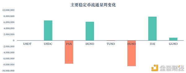 过去一周,稳定币市值增加了约529万美元。其中,USDC、BUSD、DAI、GUSD 的流通量分别增加660万、617万、788万、91万,PAX、TUSD、HUSD的流通量分别减少767万、10万、849万,USDT的流通量不变。