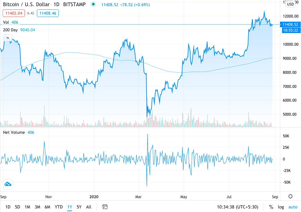 在此处的1年BTC价格图表上,价格几次跌破200天均线,