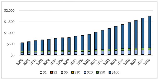 钞票是央行货币中最明显的形式,因为它们为公众广泛使用。美联储钞票是美国的官方货币,于1914年随着美联储的建立而首次发行。截至2020年3月31日,约有1.8万亿美元的美联储钞票在流通。根据一项经济研究,约有一半的美国流通货币在国外持有。与流行的“现金死亡”报告相反,即使支付交易的现金使用量可能下降,最终用户仍会持有美联储钞票。表1显示了过去二十年来流通中的美联储钞票的价值增长。