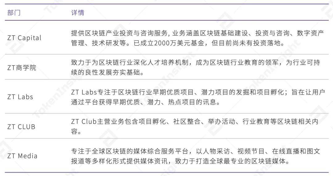 产品方面没有全面铺开,但在其他方面,ZT交易所尽可能在自身范围内覆盖对行业的发展进行支持。在内部,ZT成立了ZT Capital和ZT Labs等多个部门,包含了对区块链行业和项目的研究和市场教育等方面。ZT内部生态建设的主要目的是为了全面地跟踪市场,支持外部生态布局。目前,据ZT披露,其对DeFi、波卡、存储类领域均有布局,例如,平台已上线DOT等波卡生态项目,并将于近期开放波卡和存储类专区和上线数个波卡生态项目。部门具体情况如下表所示。