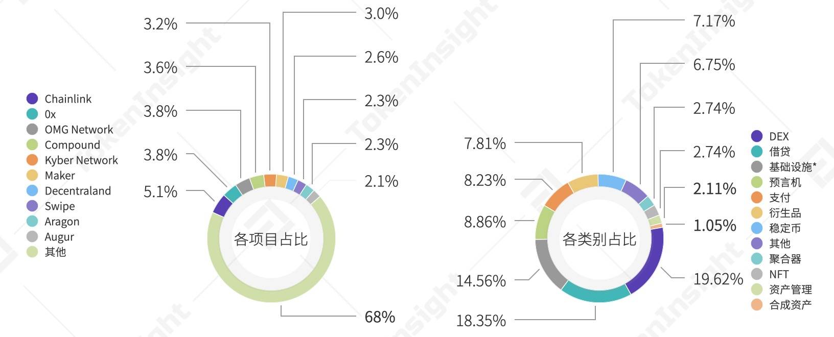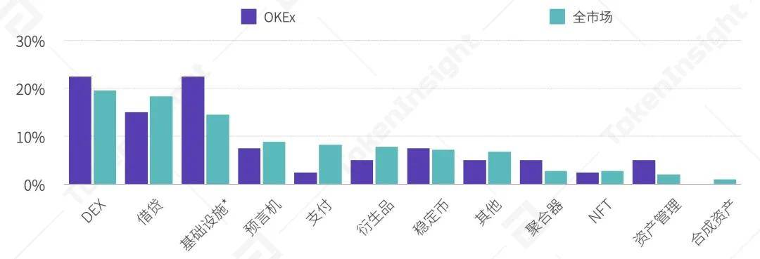 TokenInsight Research对OKEx上线的DeFi代币进行进一步分析。OKEx所上线的DeFi代币种类分布和全行业主流交易所上线的DeFi代币种类分布趋势基本一致。平台在对于DEX、基础设施、稳定币、聚合器和资产管理类项目的上线上高于行业均值;而在借贷和预言机等项目的上线上低于行业平均。