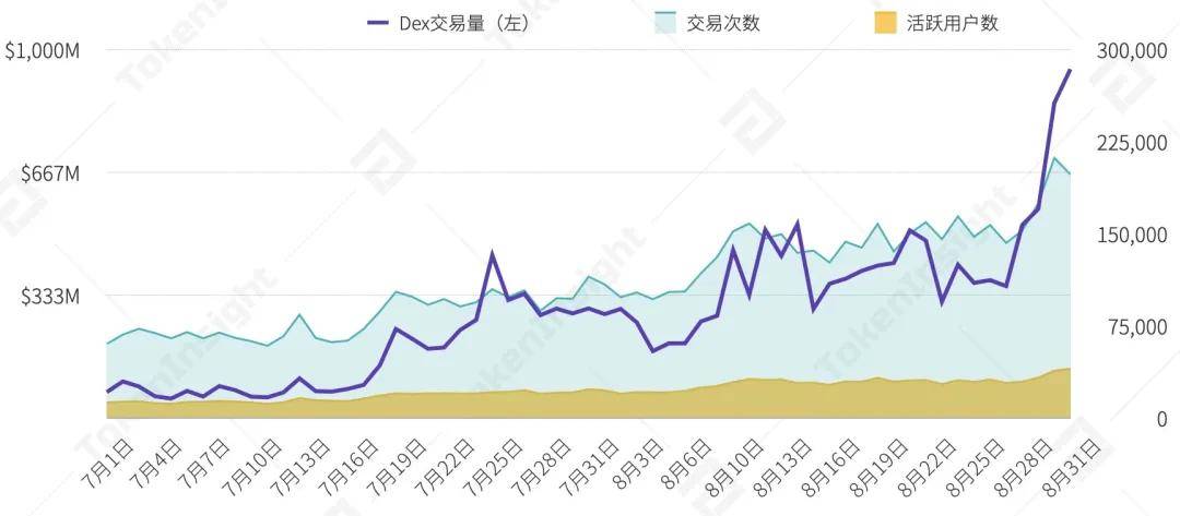 DEX交易量、交易数和活跃用户数,来源:DeBank,TokenInsight