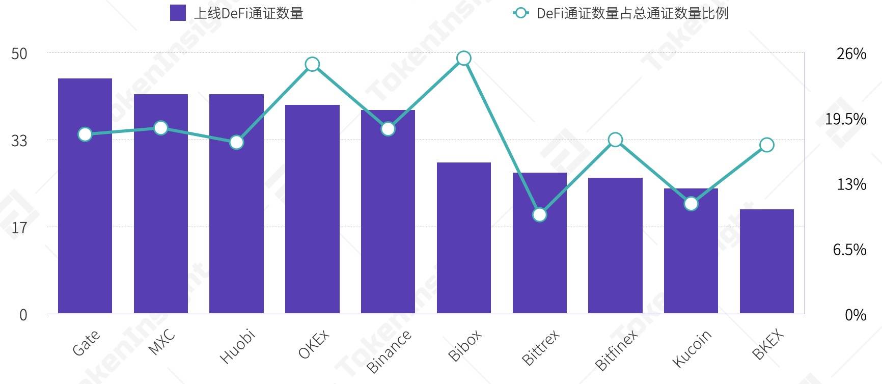 中心化交易所上线DeFi通证数量,来源:CoinMarketCap, TokenInsight,2020.08.28