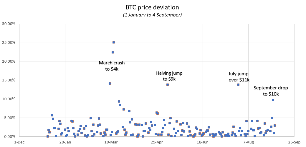 其他两个超过10%的偏差是在第三个区块日期之前一天将9,000美元以上的价格减半,减幅为13.7%,7月27日超过10,000美元的价格也减幅为13.7%。就背景而言,9月4日从$ 12,000跌至$ 10,000是偏离前10名的9.7%,但值得一提,是全年第六高的偏离。