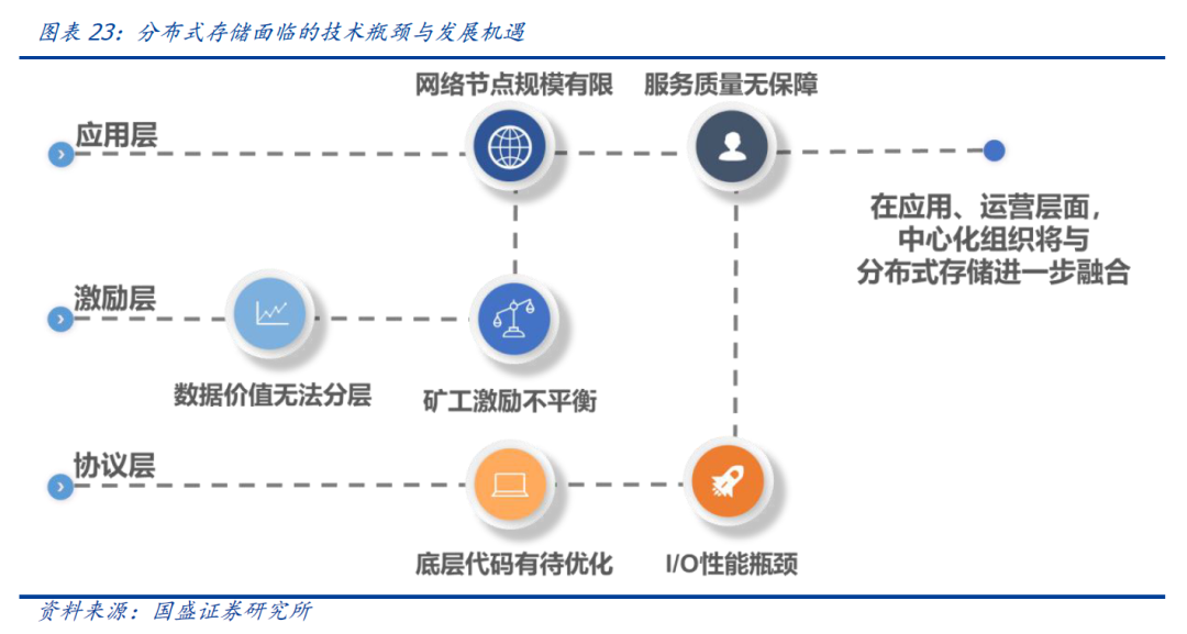 基于分布式存储的前景:分布式存储为互联网基础构架和商业模式带来的变革与创新空间,将开辟新的存储应用市场。分布式存储采用不同于传统中心化存储的资源和市场激励方式,可以解决中心化互联网架构下安全性、时效性及成本问题,将带来互联网基础架构变革。另一方面,分布式存储为个人节点加入市场交换创造了基础,可以深度挖掘数据内容价值,开辟全新的存储空间和应用市场。目前的分布式存储仍面临I/O性能问题、数据价值分层、应用服务质量等技术瓶颈,在实际应用中需要引入中心化组织进行弥补。