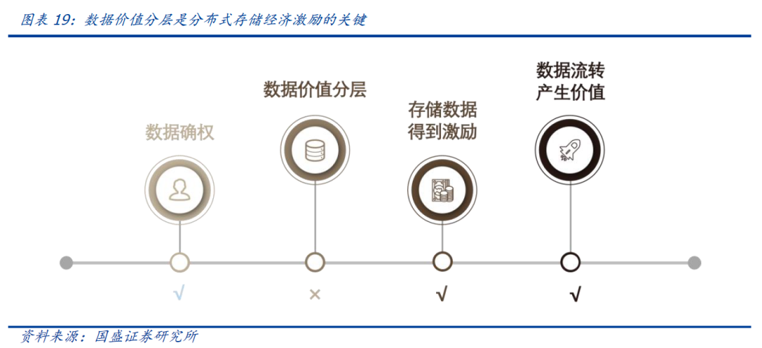 数据价值分层是甄别数据价值以及实现有效激励的关键。分布式的节点负责存储数据碎片,但并不知道数据内容以及数据的价值,也就是说,矿工的工作量衡量如果不能考虑数据价值的因素,就很难实现更优化的市场激励调节。以Filecoin采用的时空证明(PoST)机制为例,矿工节点的存储工作量衡量,与文件碎片内容的数据价值无关。Filecoin目前并没有对数据价值进行具体分层,只做了垃圾数据和可验证数据的区分。目前现存的共识机制,均仅限于矿工的存储工作量衡量,而无法代表数据价值。矿工节点的物理损毁、网络服务质量差的成本是以经济激励来衡量,但因此造成的用户数据服务质量和数据价值损失并不对等。简单说,矿工最多损失的是系统经济激励,而用户损失的可能是数据的损毁或极差业务服务质量——毕竟对于矿工来说,数据的价值是的核心衡量因素是存储容量。